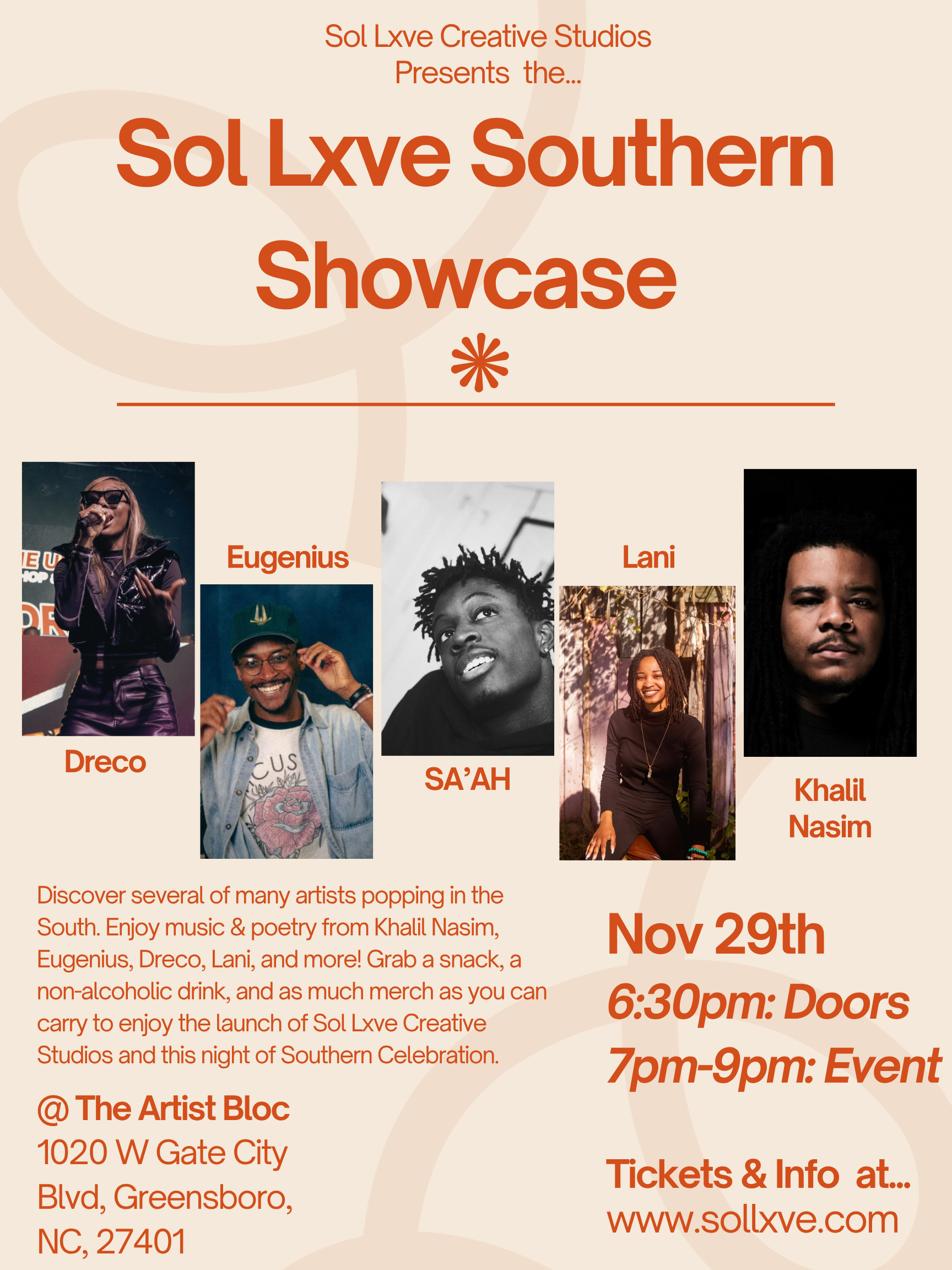 Come join us November 29th at The Artist Bloc Event Venue for a night of incredible Southern music, poetry, and culture. Discover several of many creative voices and talented artists that are popping in the South. Enjoy music and poetry performances from Khalil Nasim, Eugenius, Dreco, Lani, SA'AH, and james solomon, master DJ-ing by Sifi, and business showcases from Jahmed with Demhaj Poetry Lounge and Sazi with Sazi events. Grab a Southern snack, non-alcoholic drink, and as much merch can carry to immerse yourself in an intimate space with soulful tunes, captivating visuals, and a sense of community like no other. Whether you're a music lover, poetry enthusiast, Southern-based creative, or just looking for a fun night out, you'll enjoy this night of Southern Celebration--the launch of Sol Lxve Creative Studios.